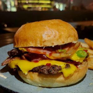 double beef patty, onion, pickled jalapeno, bacon, house-smoked cheese, chili oil, house-made chipotle mayo
