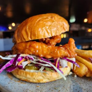 fried chicken, house-made hot honey ranch sauce, slaw & pickles